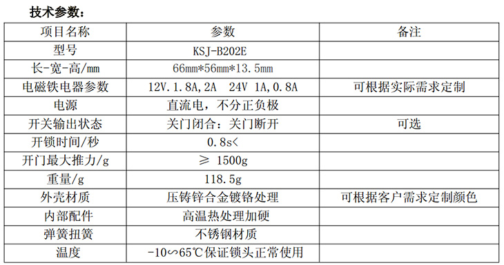 KSJ-B202E采用關門(斷電)上鎖、通電(8-24V) 瞬間觸發打開的工作模式。 四線單開關。適合各種智能信號附加使用。